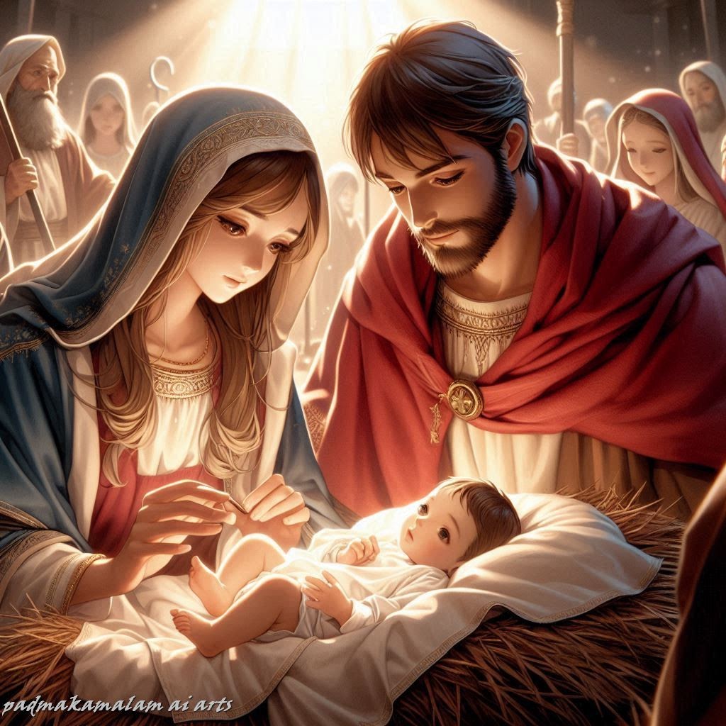 Create a detailed and anime art depiction of a Nativity scene featuring baby Jesus, Mary, and Joseph. The composition should capture the serene and sacred atmosphere of the moment, highlighting the expressions and emotions of the figures. Consider the lighting, textures, and surroundings to evoke a sense of warmth and reverence, while ensuring that the characters are portrayed with authenticity and respect for the traditional representation – bing ai